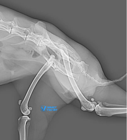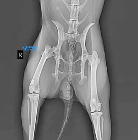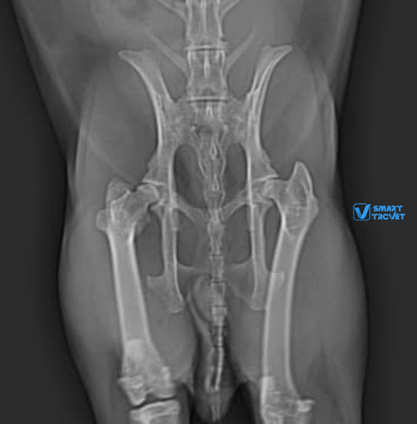 Lili, a two-year-old female rabbit, fell from her owner’s arms, resulting in lameness of the right leg. Radiographs of the pelvis and right hindlimb (excluding the area from mid-tibia to foot) were prepared and found to be of good quality. The radiographs revealed a complete luxation of the right coxofemoral joint, with a dorso-cranial displacement. Both acetabula and the left hip appeared normal. Hip dysplasia was not present. All other bones and joints of the hind limbs were normal, with no additional radiographic abnormalities identified. The final diagnosis, based on the radiographic findings, was traumatic dorso-cranial luxation of the right hip joint.